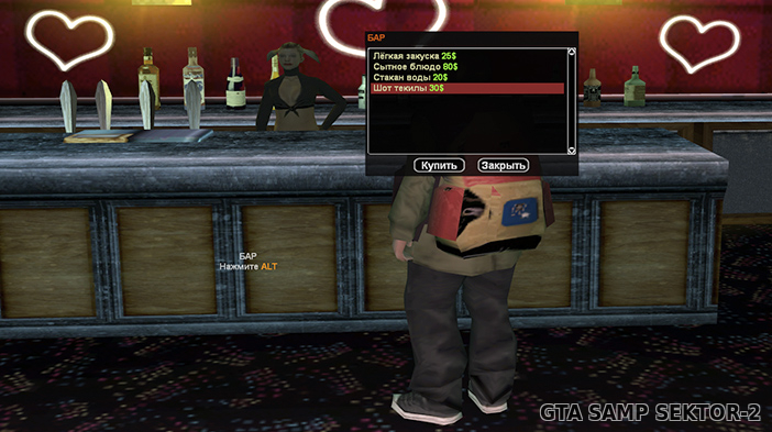- Имеется бар, где можно утолить голод и жажду или заказать алкоголь. Легкое блюдо - прибавит немного сытости, сытное - пополнит сытость на максимум. Вода утоляет жажду, а алкоголь имеет все свойства крепких напитков - согревает, сдвигает желание от зависимости, опьяняет и прочее. Все цены такие же, как и у Иваныча.